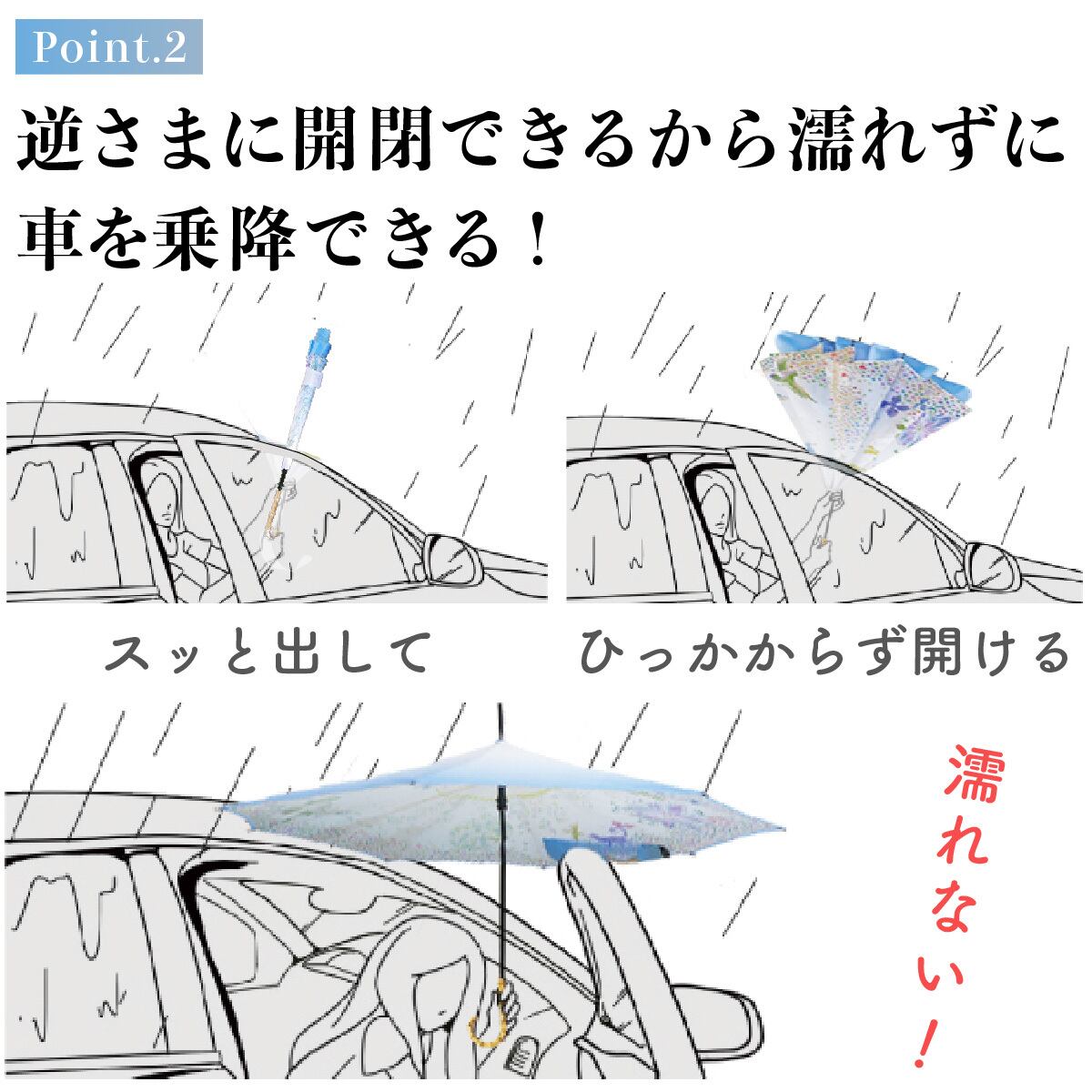 逆さ傘なので閉じた時にも手を濡らさず、自立するのでさまざまなシーンで便利に使っていただける機能性も魅力です。